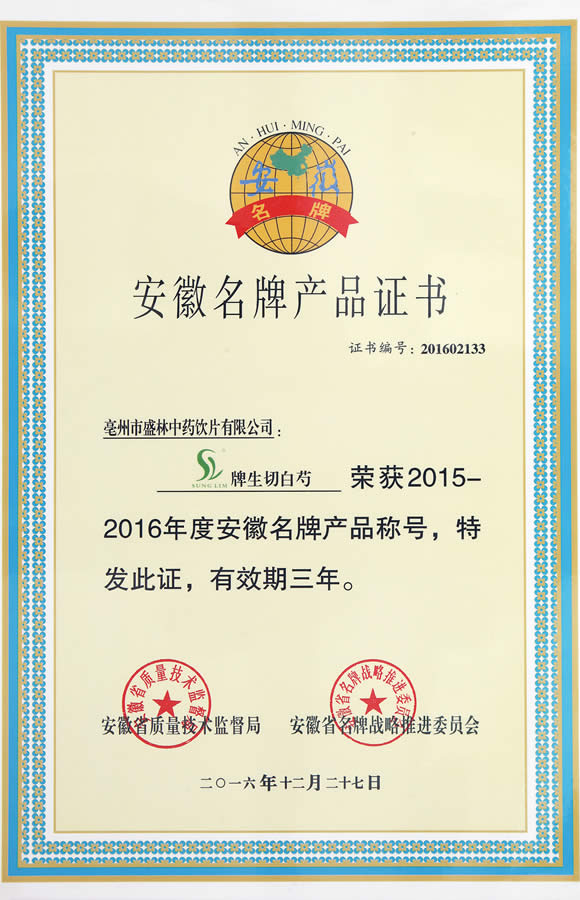 2015-2016年度安徽省名牌產(chǎn)品證書(shū)