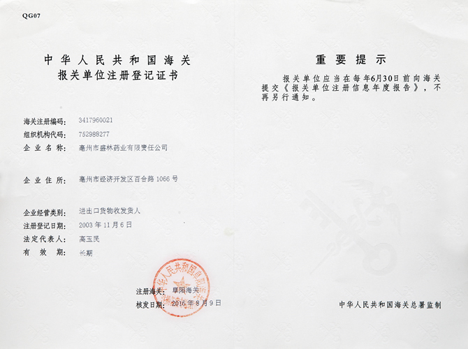 Registration Certificate of Customs Declaration Unit of the People's Republic of China
